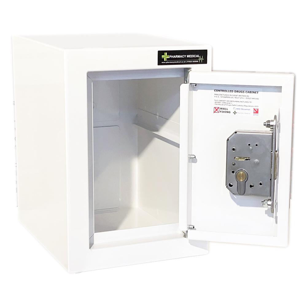Manufactured in the United Kingdom by Pharmacy Medical, this cabinet is built to the highest standards of safety and compliance. It conforms to BS2881:1989 (Security Level One), the specification for medicine storage in healthcare premises, and fully complies with the Misuse of Drugs (Safe Custody) Regulations 1973.