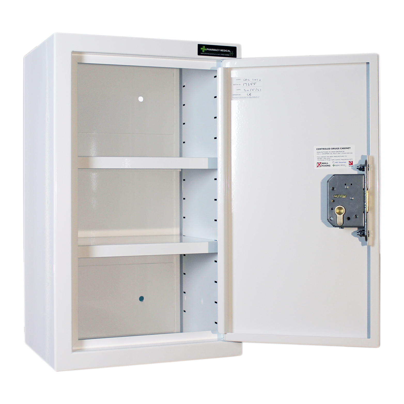 Manufactured in the United Kingdom by Pharmacy Medical, this cabinet is built to the highest standards of safety and compliance. It conforms to BS2881:1989 (Security Level One), the specification for medicine storage in healthcare premises, and fully complies with the Misuse of Drugs (Safe Custody) Regulations 1973.