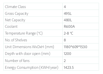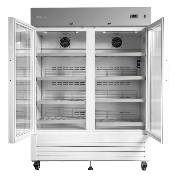 This Coolmed CMG500 is a large-sized glass double door refrigerator and has a net capacity of 480L and provides plenty of storage space in a compact cabinet. It is is fitted with 2 cooling fans, to ensure stability of temperature from top to bottom. It defrosts automatically and is fitted with a 2m plug for ease of installation. The temperature range is from 2-8°C and is stabilised by our high quality temperature sensor, which keeps the internal temperature even and stable.