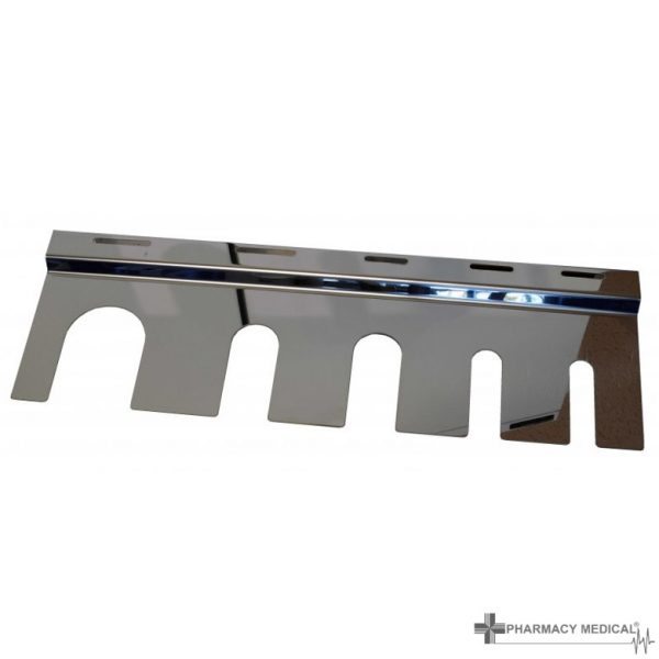 High quality polished stainless steel pharmacy dispensing measure rack. Complete with the facility to hold 5 measures and 5 spatulas.