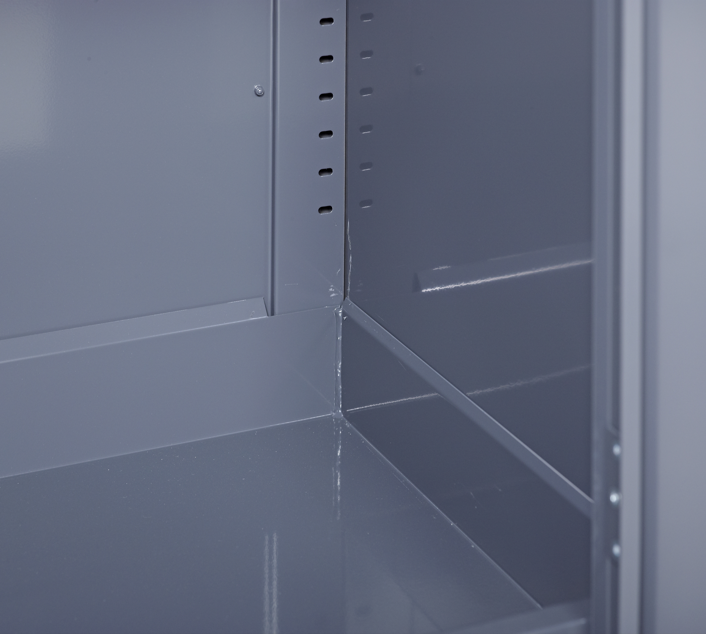 - Adjustable spill-retaining galvanised shelves for superior spill management with a UDL of 50KG.
