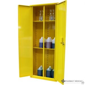 Pharmacy Medicalsā hazardous substance CoSHH cabinets are manufactured from CR4 1.2mm mild steel and finished in a Yellow powder coat. Because of this, they are strong, durable, and easy to wipe clean. Furthermore, the cabinets include applied mandatory BS5378 warning labels.