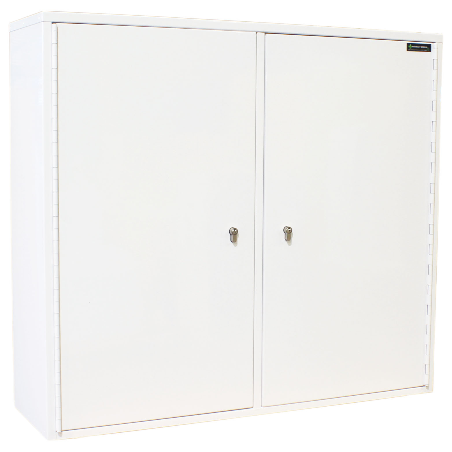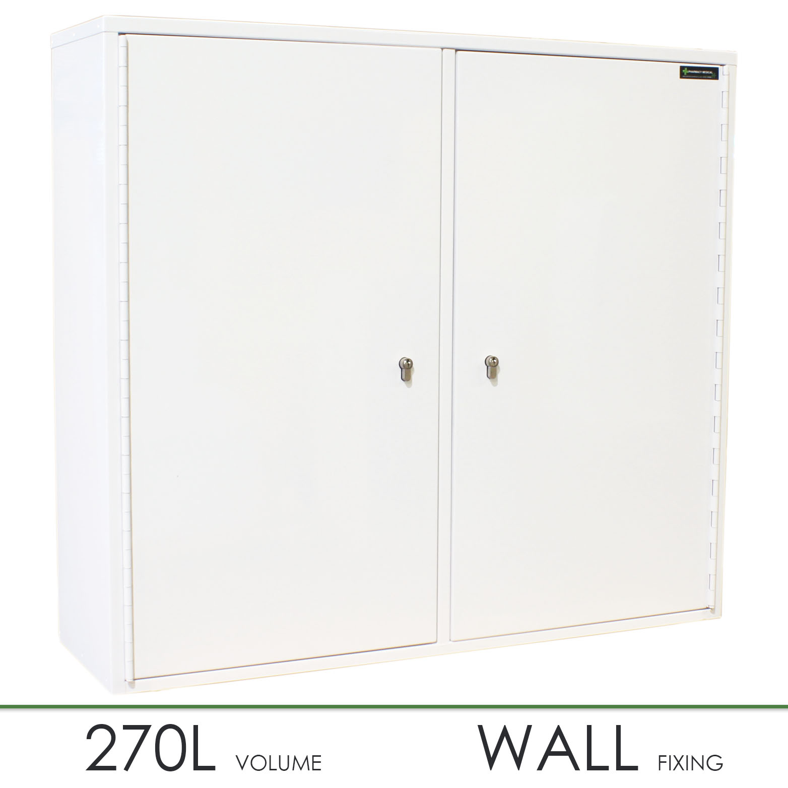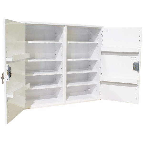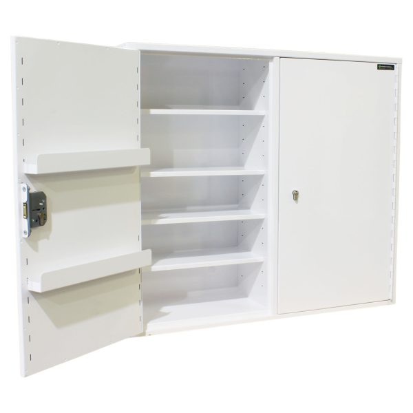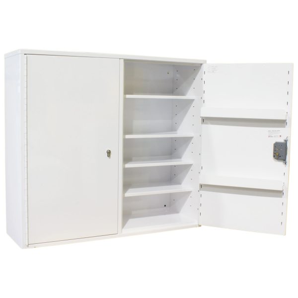 All our Medicine Cabinets are manufactured in house at Pharmacy Medical. This MED424 double locking medicine cabinet is manufactured to BS BS2881:1989, level one, they are suitable for storing medicines in healthcare premises. This double door, double locking cabinet features full depth shelving and no door shelves. It comprises of two independently locking sections separated by a solid divider own the centre of the cabinet.