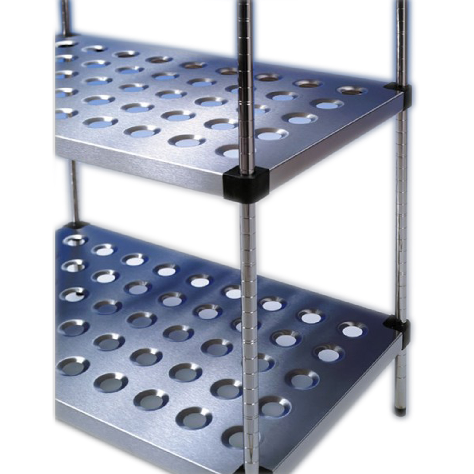 These perforated stainless steel racking solutions come complete with 25mm diameter poles grooved at 25mm increments and feature adjustable non-marking plastic feet fitted as standard.