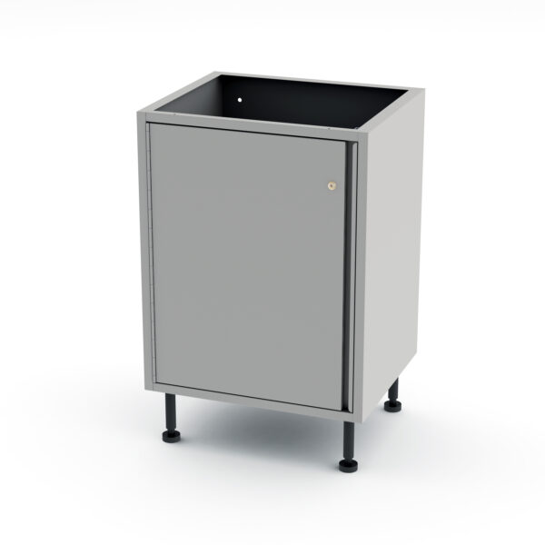 This left hand hinged stainless steel base unit has been designed to follow the same principle as a fitted kitchen. Please note that this item does not include any worktop or plinth. Designed around a modular approach, these cabinets come with height adjustable feet and are designed to be set off the wall behind to allow for any pipework or curved flooring edges that may be present. Featuring height adjustable internal shelving and are available with sloping tops (tower and wall units only)
